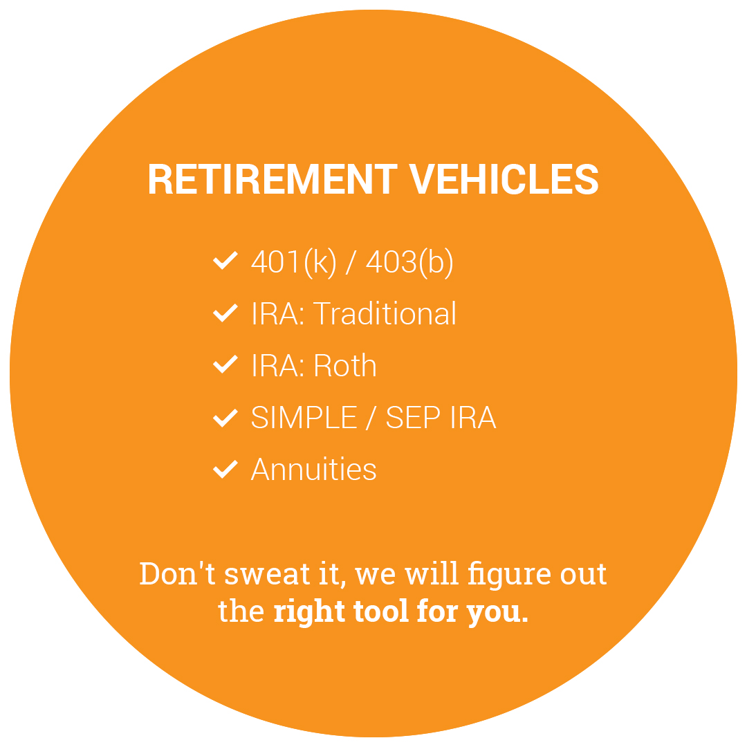 We get to know you first, and then your retirement goals. If we’re a fit for you and you think we can help you, we develop a clear strategy that includes what you’ll need to do including specific investment vehicles that get you the furthest and fastest towards funding your retirement, when you’ll need to do it, how much you’ll need to invest, and for how long. Then we’ll work alongside you in that journey as changes occur, to help keep you on that path.